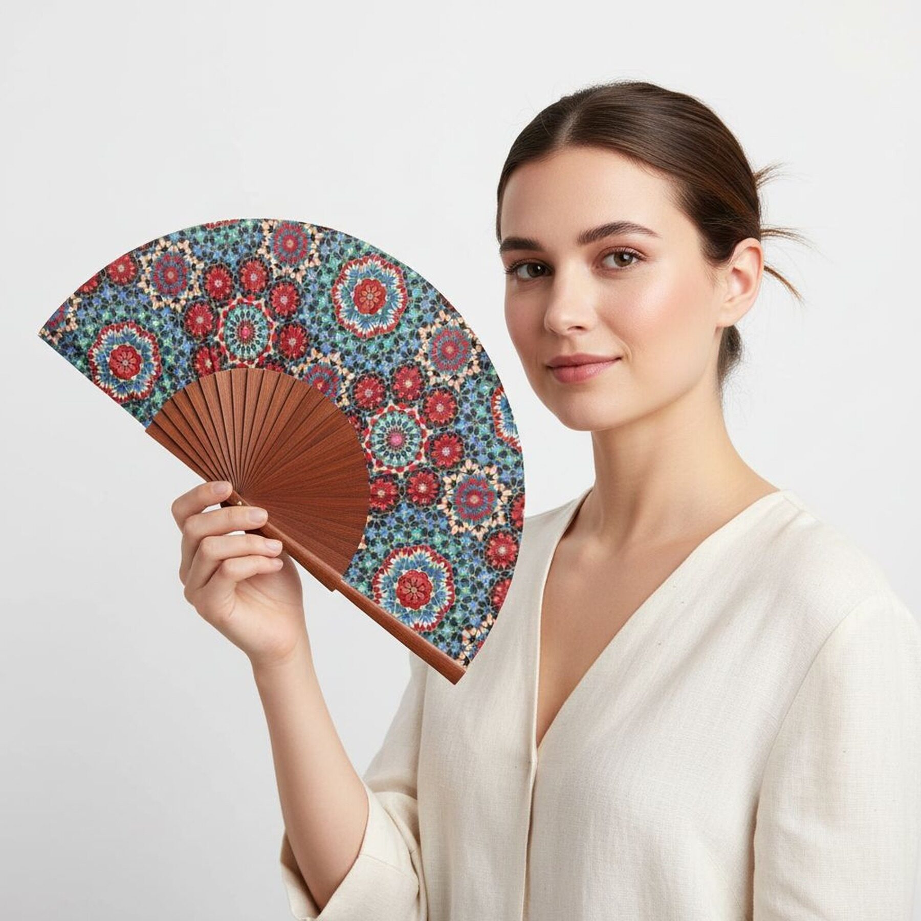 Handcrafted silk fan made with 100% natural wood in Spain.