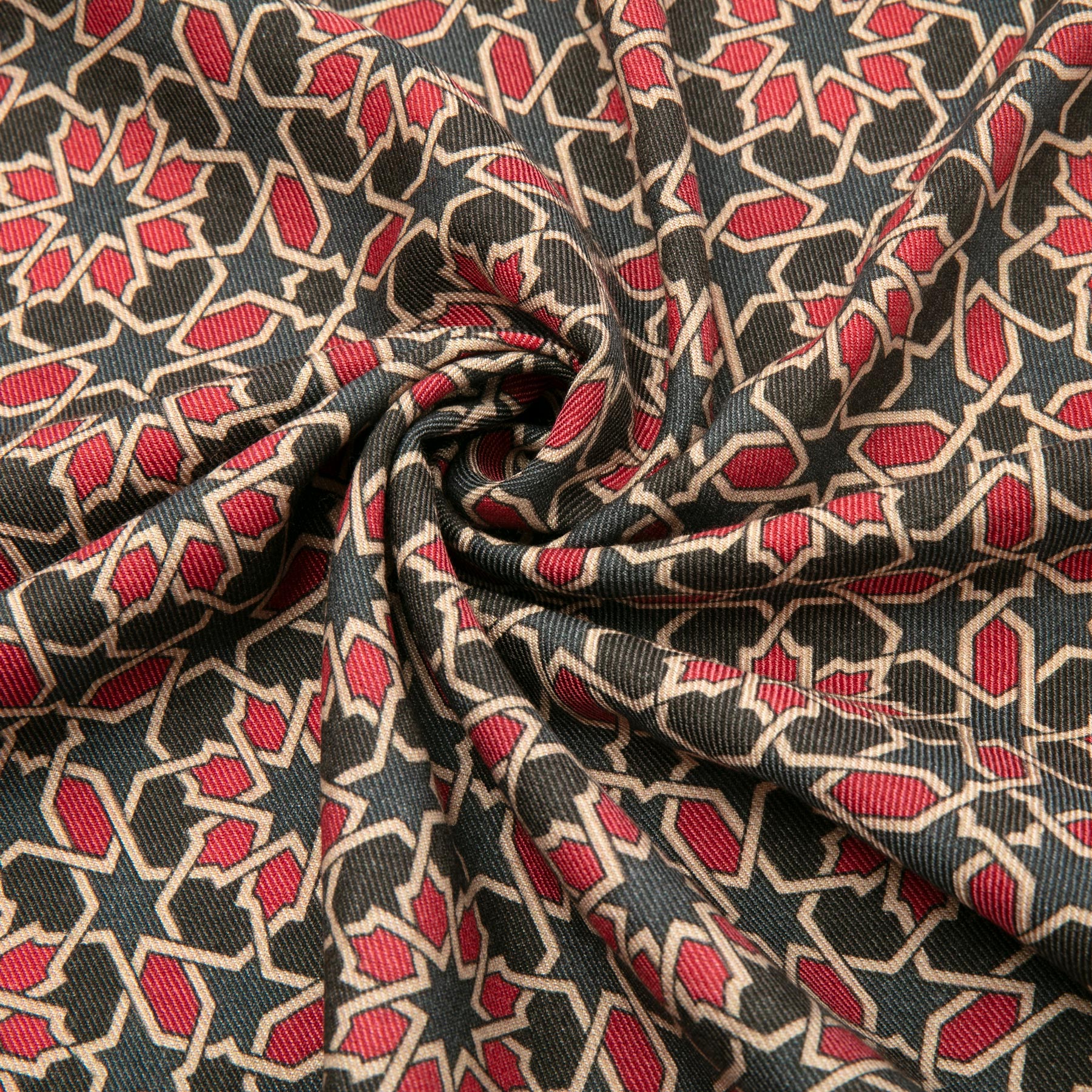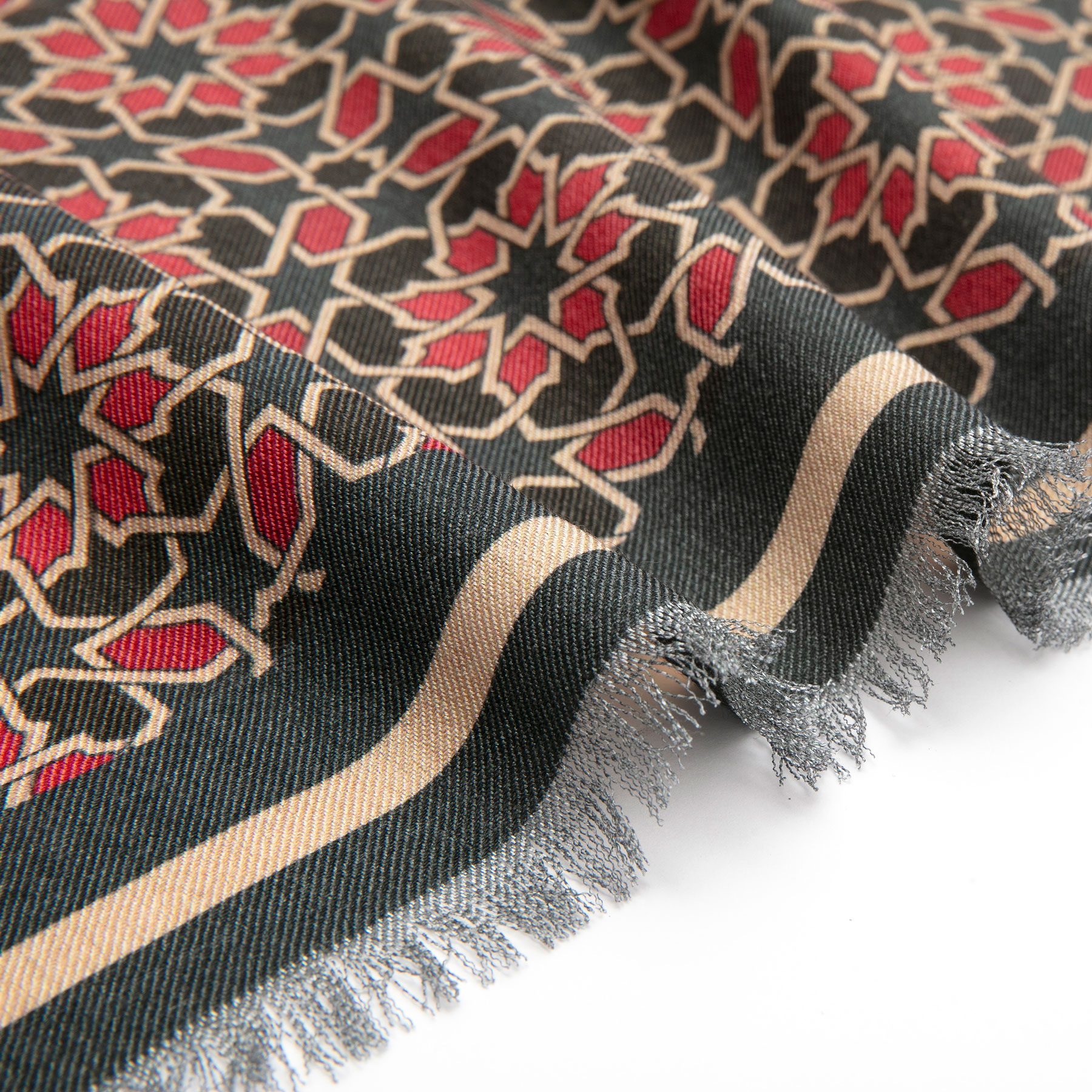Silk and wool printed scarf featuring a colorful print inspired by Islamic Geometry from the Alhambra Palace of Granada.